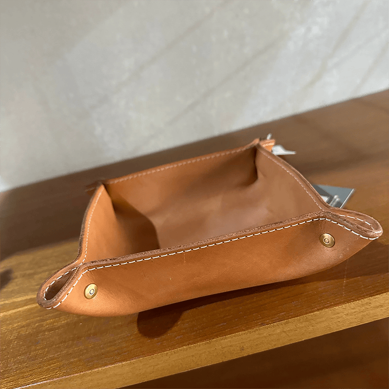 A tidy spot for your everyday essentials. The Catch-All valet tray is handcrafted in Spain from full-grain, vegetable-tanned leather. With a sleek 5″ × 5″ size, it's ideal for your entryway, nightstand, or desk—organizing keys, wallet, coins, and more while developing a rich patina over time.